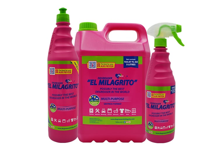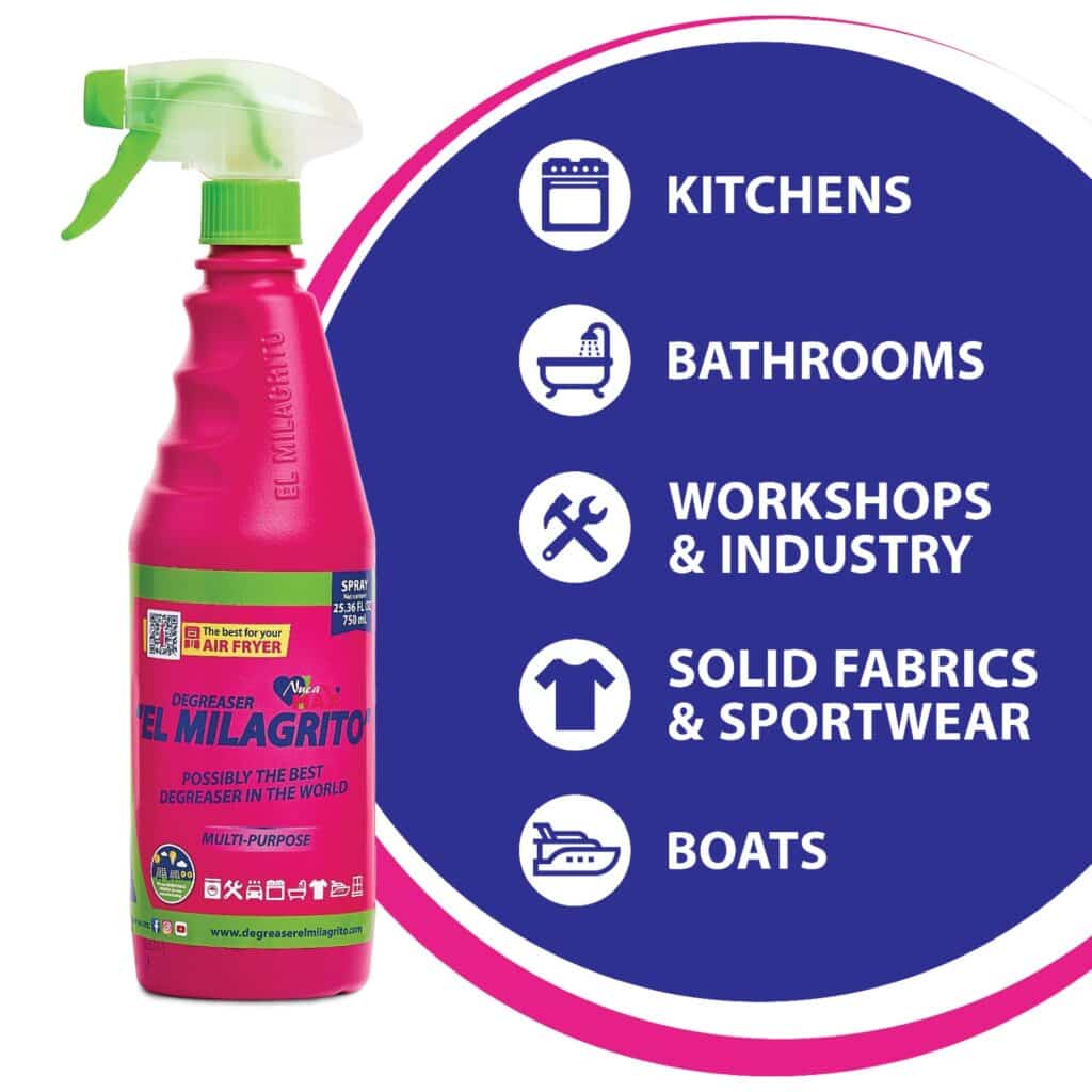 Ceramic hobs, ovens, stovetops, microwaves, worktops, extractor hoods, floors, tiles, taps, pans, pots, pans, barbecues, paella pans, sinks... Spray directly and rinse well with a cloth.